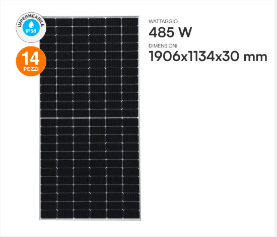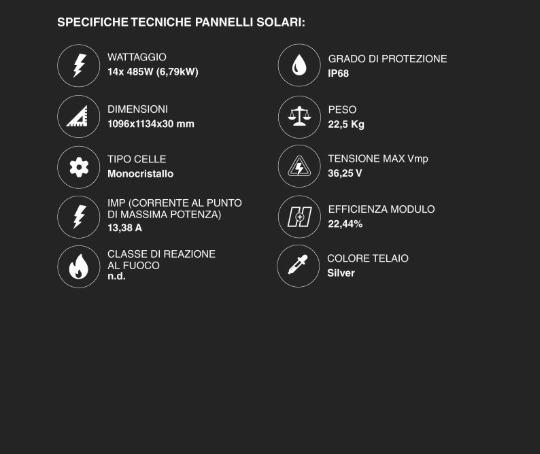Tecnologia: Monocristallino Half-Cut ad alta efficienza. L'uso di moduli da 485W permette di ottenere una potenza elevata riducendo il numero di strutture di fissaggio necessarie.