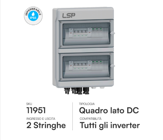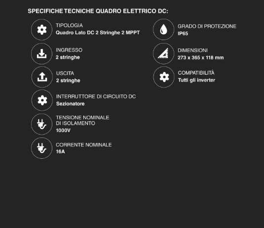 Quadro DC (2 Stringhe): Fornito di scaricatori di sovratensione (SPD) di Classe II e portafusibili per proteggere l'inverter da fulmini e picchi di tensione.