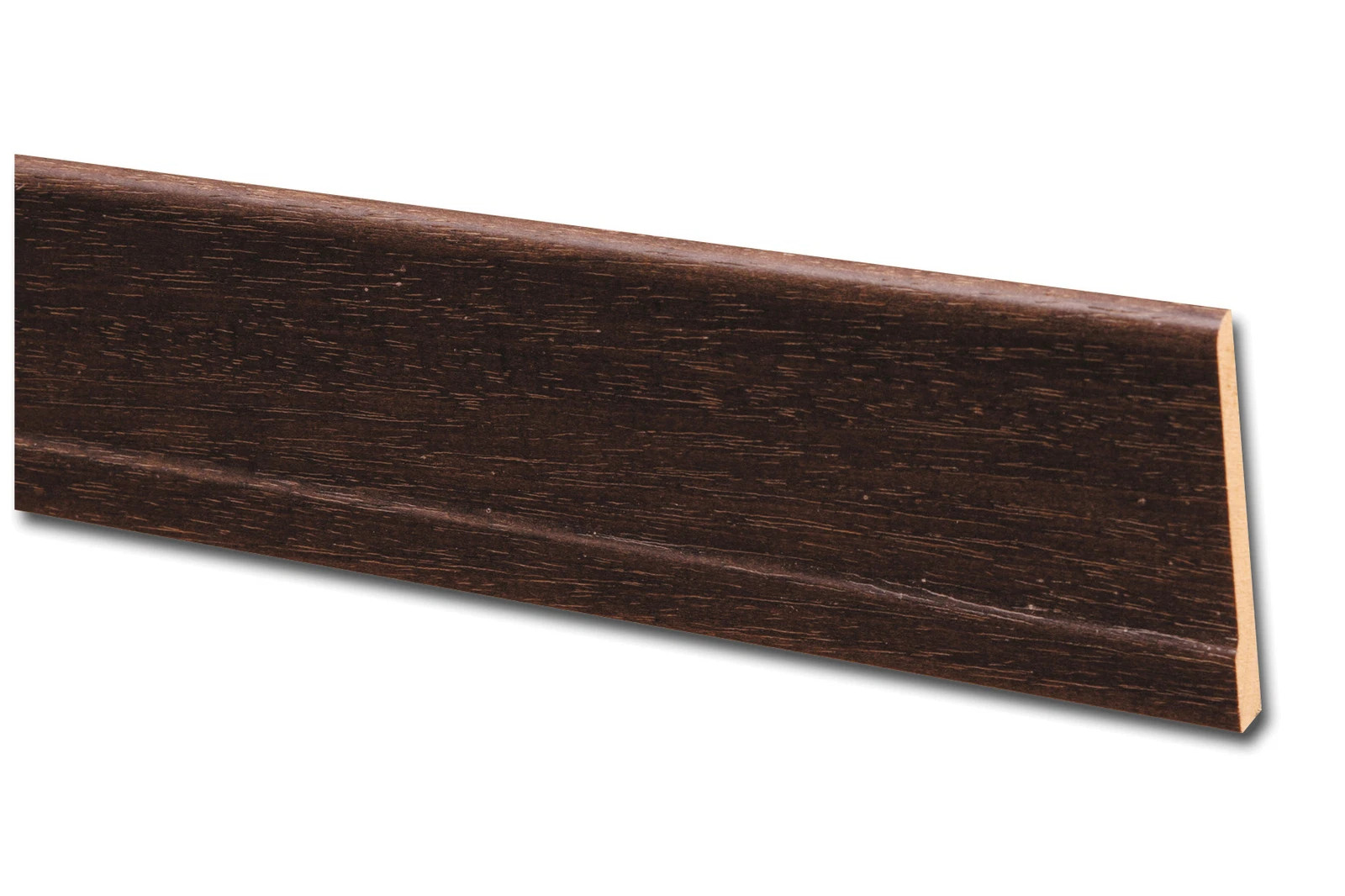 La finitura verniciata color Noce Scuro conferisce al prodotto un aspetto elegante e autoritario, perfetto per ambienti dallo stile tradizionale, rustico o per creare contrasti decisi in interni moderni. Il design "con piede" (ovvero con la base leggermente sporgente verso l'esterno) non ha solo una valenza estetica, ma è estremamente pratico: permette di coprire efficacemente i giunti di dilatazione perimetrali dei pavimenti flottanti e protegge la parte inferiore della parete da urti e sporco durante le pulizie.