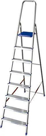 Scala in alluminio con 8 gradini larghi antiscivolo, dotata di pedana ampia e montanti rinforzati.