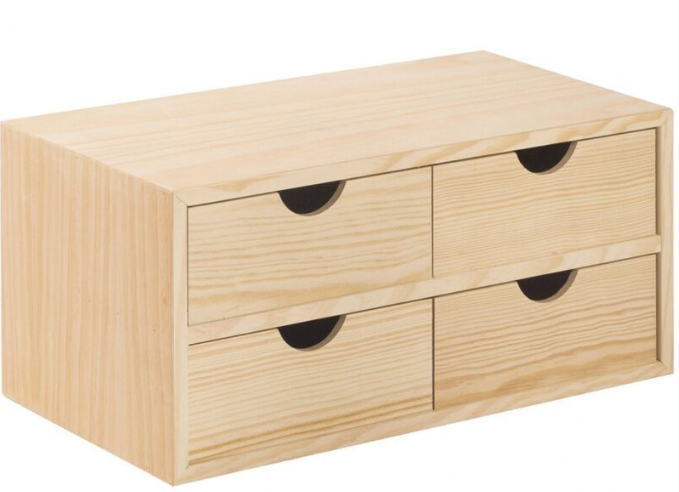 L'Art. cap8712 è l'organizer ideale per chi cerca una soluzione di archiviazione a basso profilo. Caratterizzata da una struttura a 4 cassetti affiancati e sovrapposti, questa mini-cassettiera in legno naturale offre una superficie d'appoggio superiore generosa, pur mantenendo un'altezza contenuta di soli 18,5 cm.