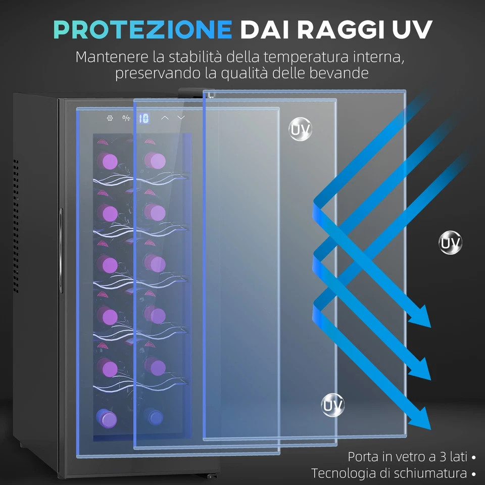 Conserva i tuoi vini pregiati alla temperatura ideale con questa cantinetta frigorifero professionale, progettata per ospitare fino a 12 bottiglie in un ambiente protetto e tecnologicamente avanzato. La caratteristica distintiva di questo modello è il doppio controllo della temperatura, che consente di gestire zone climatiche differenti per preservare al meglio sia i vini rossi che i bianchi, garantendo a ciascuna tipologia il microclima perfetto per l'affinamento e il servizio. Il design total black elegante e compatto la rende un complemento d'arredo perfetto per cucine moderne, zone living o uffici di prestigio.