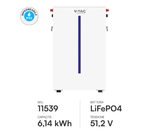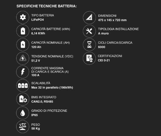 Tecnologia: Litio-Ferro-Fosfato (LiFePO4), la chimica più sicura per uso domestico, esente da rischi di instabilità termica.