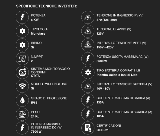 Questo kit costituisce il pacchetto tecnologico ideale per chi desidera potenziare un impianto esistente o configurare un nuovo sistema di accumulo ad alta potenza. Con un inverter da 6 kW (il massimo consentito in regime monofase in Italia) e una batteria da 6,14 kWh, il sistema garantisce prestazioni eccellenti per abitazioni con consumi elevati, come quelle dotate di pompe di calore o piani a induzione.