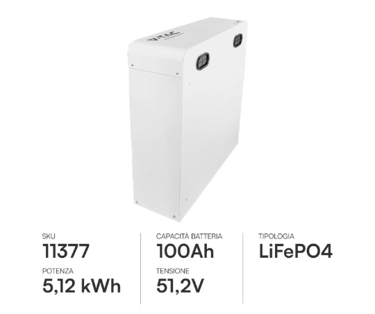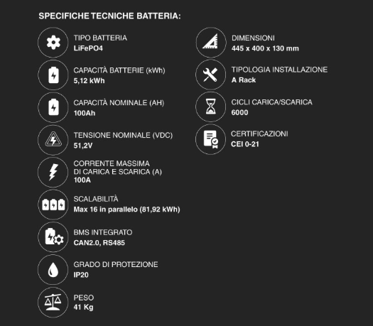 Modularità: Il sistema è facilmente espandibile: è possibile aggiungere ulteriori moduli batteria da 5,12 kWh in parallelo per aumentare la capacità di accumulo in futuro.