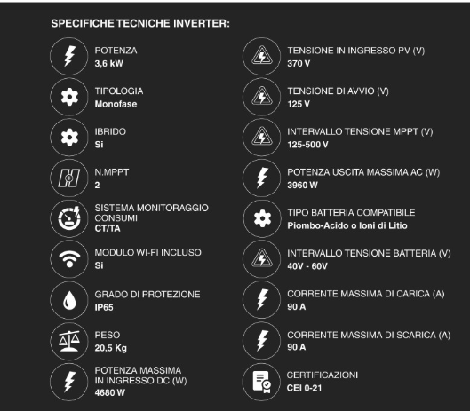 Potenza Nominale: 3600W (3,6kW), perfettamente dimensionato per le utenze domestiche standard italiane.