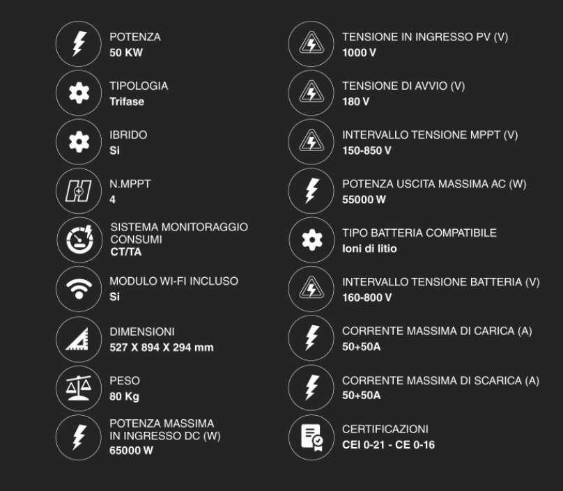 È un concentrato di potenza che non sacrifica la versatilità, integrando sia l'accumulo ibrido che le certificazioni per ogni tipo di allaccio alla rete italiana.