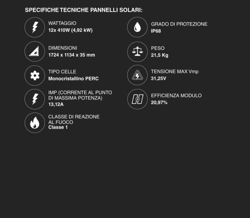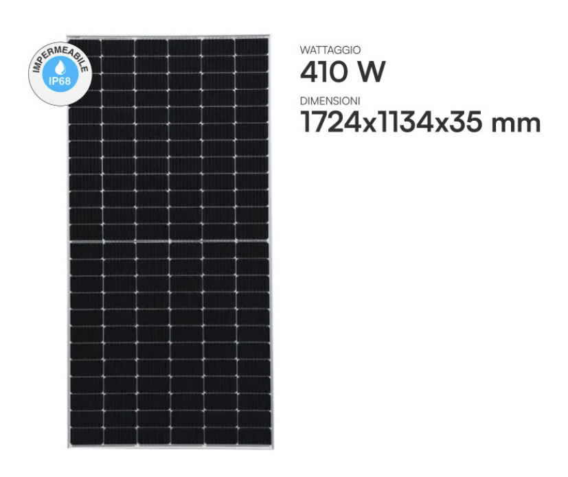 12 Pannelli Solari V-TAC 410W (4,92 kWp): Moduli monocristallini con tecnologia PERC Half-Cut (SKU 11910). Garantiscono un'efficienza del 20,97% e ottime prestazioni anche in condizioni di luce diffusa o ombreggiamenti parziali.