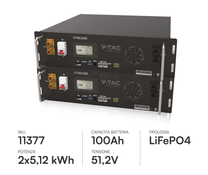 2 Batterie LiFePO4 da 5,12 kWh (10,24 kWh totali): Solitamente modelli Slim a muro (SKU 11526) collegati in parallelo. La chimica al Litio-Ferro-Fosfato è la più sicura e longeva sul mercato.