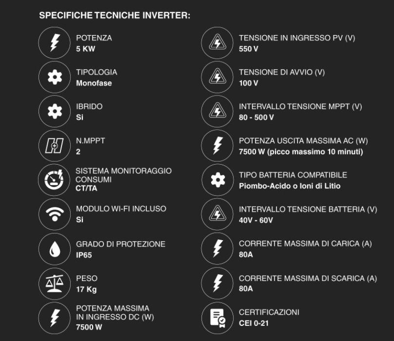 Potenza di Scarica L'inverter può prelevare fino a 5.000 W dalle batterie contemporaneamente
