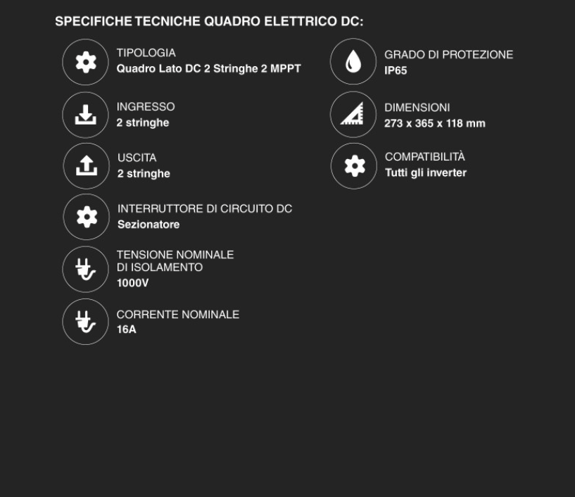 Quadro DC (2 Stringhe): Include scaricatori di sovratensione (SPD) per proteggere l'inverter dai fulmini e sezionatori per isolare i pannelli.