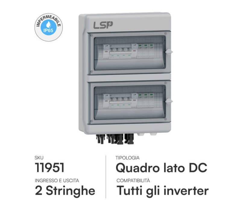 Quadro DC (2 Stringhe) Protegge l'inverter dai fulmini (Scaricatori SPD Classe II) e permette di isolare i pannelli in sicurezza tramite sezionatori magnetotermici indipendenti.
