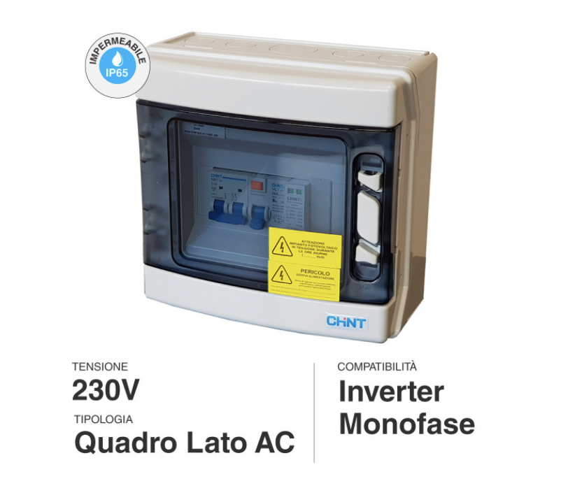 Quadro Chint AC Centralino pre-cablato con interruttore Magnetotermico e Differenziale Chint. Garantisce la protezione della linea che collega l'inverter al quadro elettrico generale di casa.