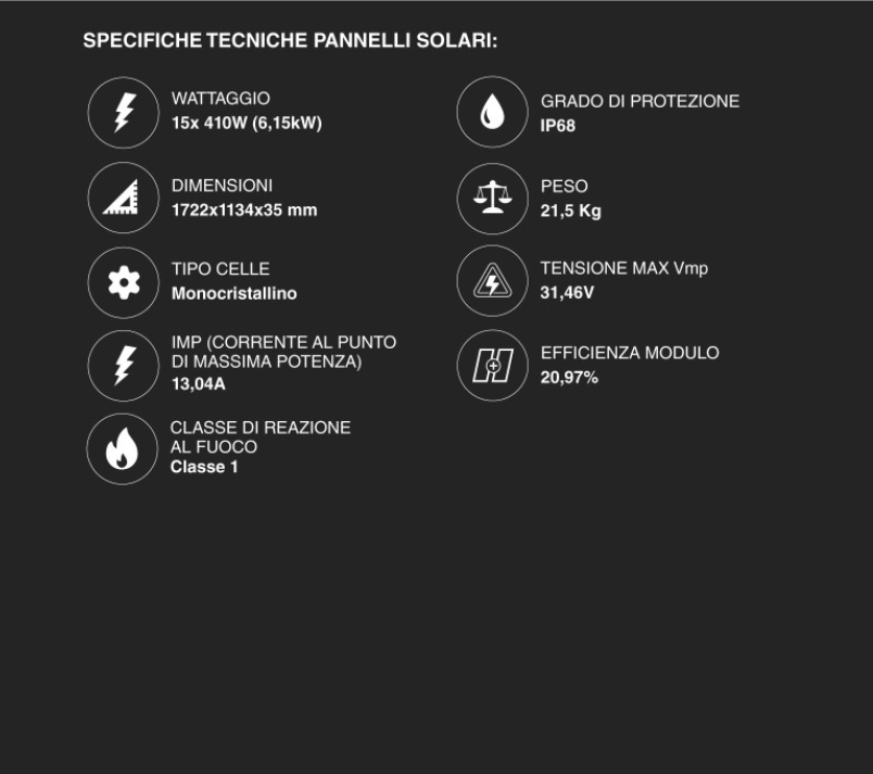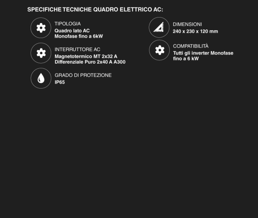 Quadri Elettrici: L'inclusione di quadri DC e AC separati è un enorme vantaggio per la sicurezza e la conformità normativa, proteggendo l'investimento da fulmini e sbalzi di tensione.