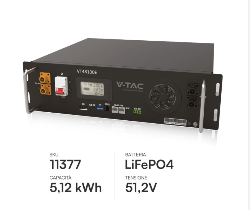 Batteria Rack LiFePO4 5,12 kWh (SKU 11448): Accumulo al litio da 100Ah a bassa tensione (48V), espandibile.
