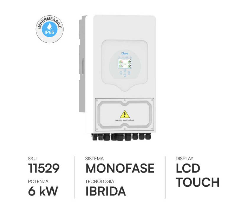 Inverter Ibrido Deye 6kW (SKU 11529): Modello monofase top di gamma, certificato CEI 0-21, con gestione intelligente dei carichi.