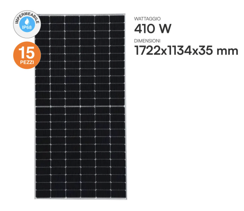 15 Pannelli Solari V-TAC/Austa 410W (6,15 kWp): Moduli monocristallini ad alta efficienza con tecnologia Half-Cut.