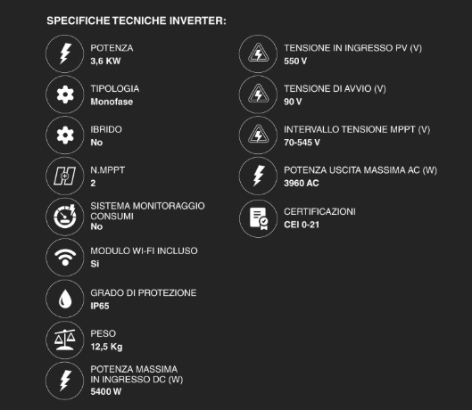 Potenza Nominale: 3,6 kW AC, ideale per le utenze domestiche standard da 3 kW o 4,5 kW.