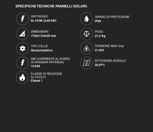 Potenza Totale del Campo: 3,69 kWp (9 x 410W).