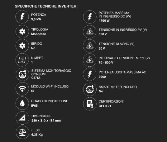 Potenza Nominale: 3,6 kW AC.
