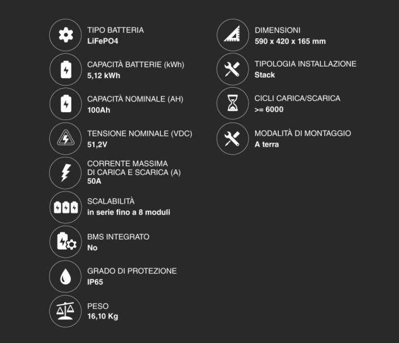 Capacità Nominale: 5,12 kWh per singolo modulo.