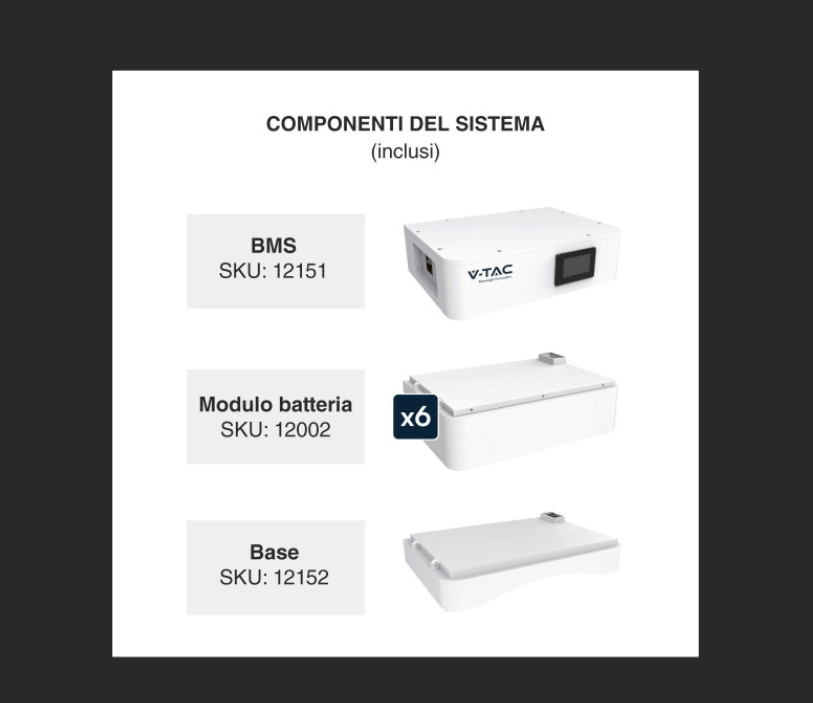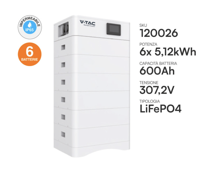 Il sistema Batterie BMS Stack LiFePO4 da 30,72 kWh ad Alta Tensione è la soluzione definitiva per grandi utenze residenziali, ville con piscina o piccole attività commerciali. Composto da 6 moduli da 5,12 kWh impilati a torre, questo kit (riferimento V-TAC SKU 120026 o serie Deye BOS-G) garantisce un'autonomia energetica quasi totale durante le ore notturne.