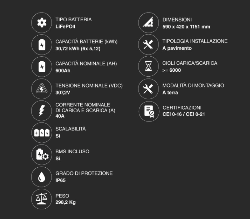 Efficienza Massima: Lavorando a 307 V, le perdite nei cavi e nell'inverter sono ridotte al minimo. Questo permette cariche e scariche più veloci e un minore surriscaldamento del sistema.