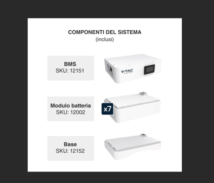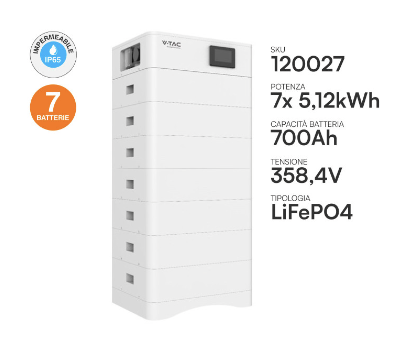 Il sistema Batterie BMS Stack LiFePO4 da 35,84 kWh ad Alta Tensione rappresenta la configurazione massima per una singola colonna di accumulo residenziale o commerciale leggera. Questo kit (riferimento V-TAC SKU 120027 o serie Deye BOS-G) è composto da 7 moduli da 5,12 kWh, un modulo di controllo BMS e una base da terra.