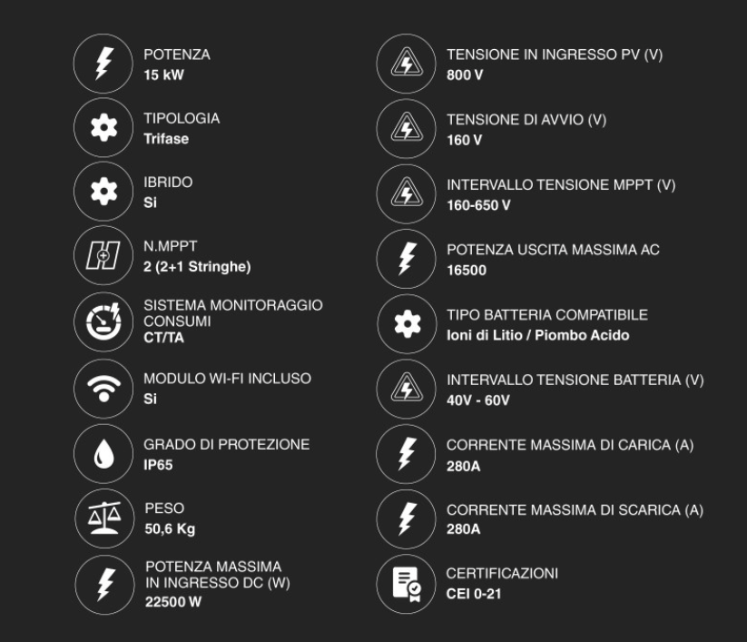 Capacità MPPT Potenziata: Spesso questi modelli da 15kW permettono stringhe di pannelli più lunghe o una corrente d'ingresso superiore, ideale per i moderni moduli fotovoltaici ad alta efficienza (oltre i 550Wp).