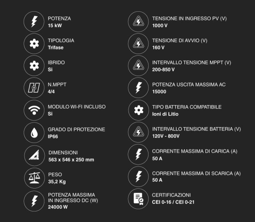 CEI 0-16: Fondamentale per la connessione alle reti di Media Tensione. Se la tua attività o la tua tenuta dispone di una cabina elettrica di trasformazione propria, questo inverter è già a norma senza necessità di interfacce esterne complesse.