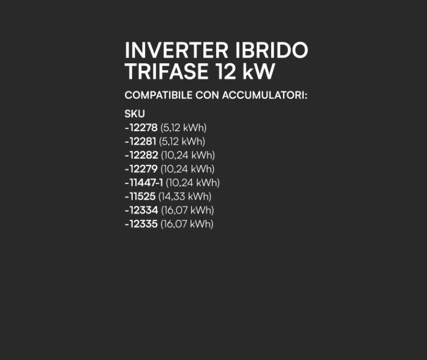Potenza Nominale: 12kW, ideale per abitazioni grandi con consumi elevati (pompe di calore, piani a induzione, ricarica veicoli elettrici).