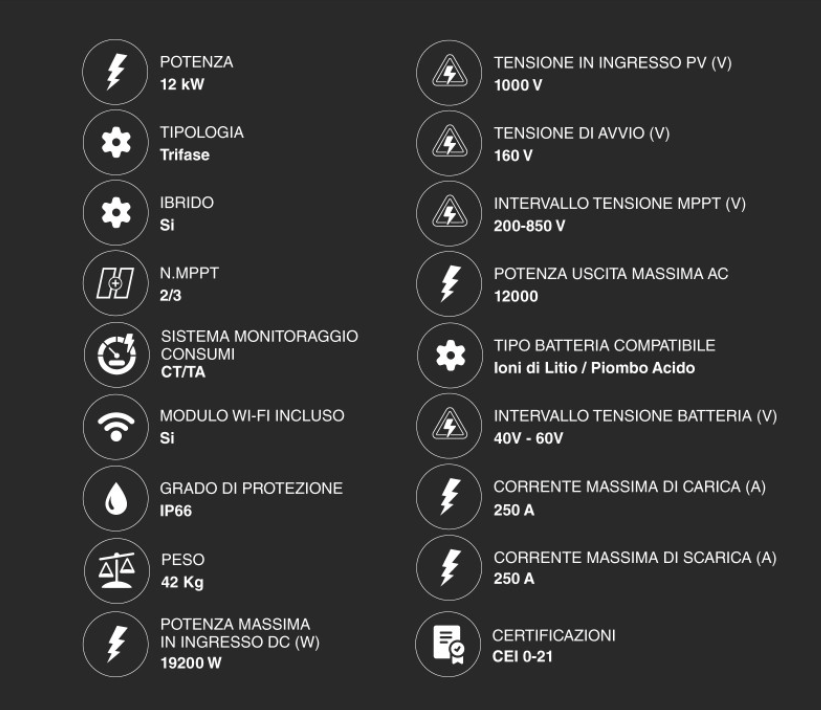 Gestione Batteria: Essendo un inverter ibrido, gestisce pacchi batteria (solitamente ad alto voltaggio) per massimizzare l'autoconsumo notturno.