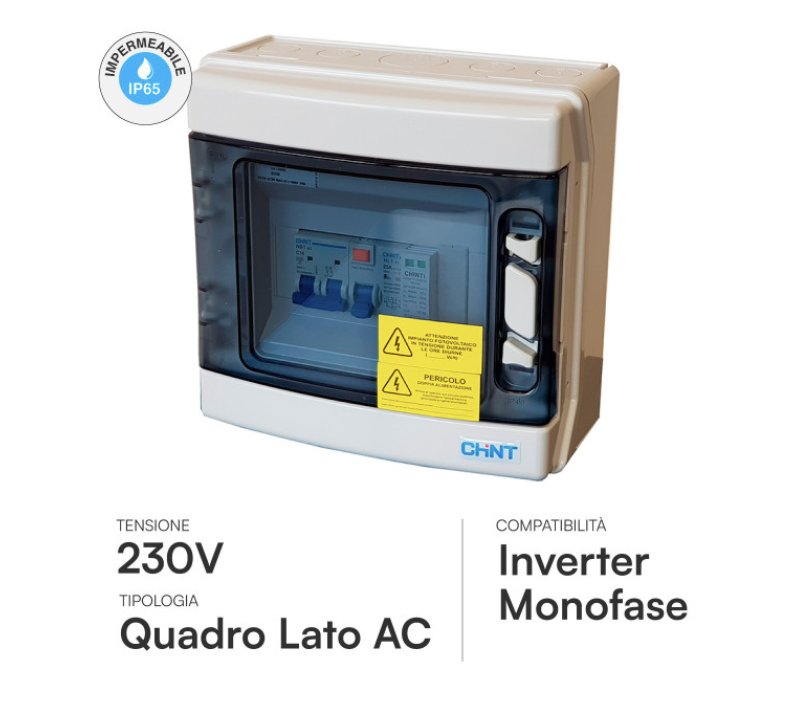 Quadro AC: Include magnetotermico differenziale Chint o Schneider per proteggere la linea verso il contatore di casa.