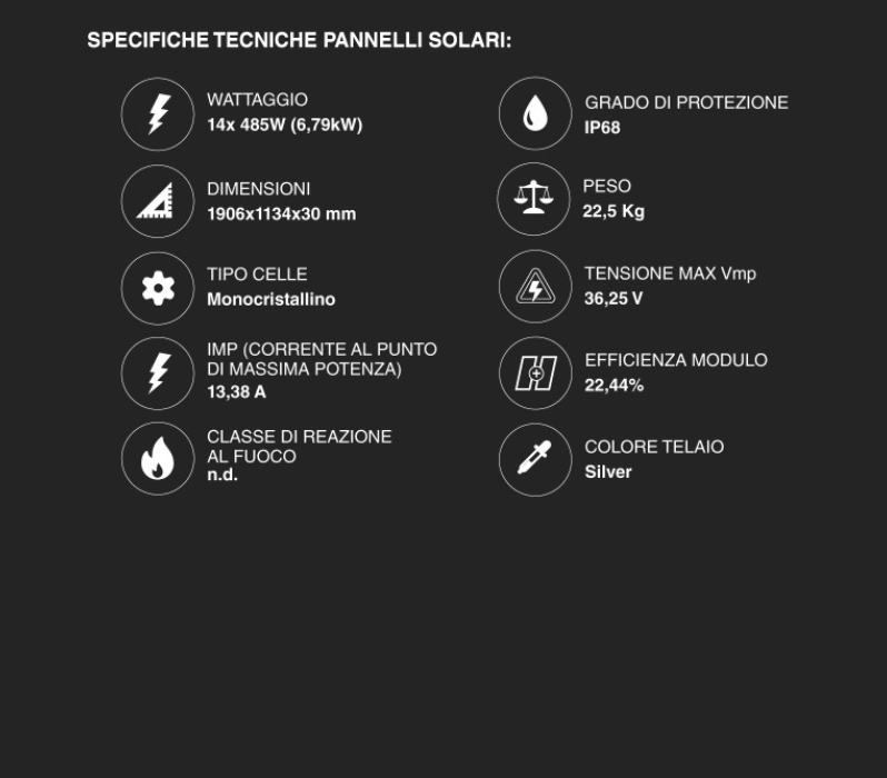 Coefficiente di Temperatura: -0,29%/°C (rendono meglio in estate rispetto ai moduli classici).