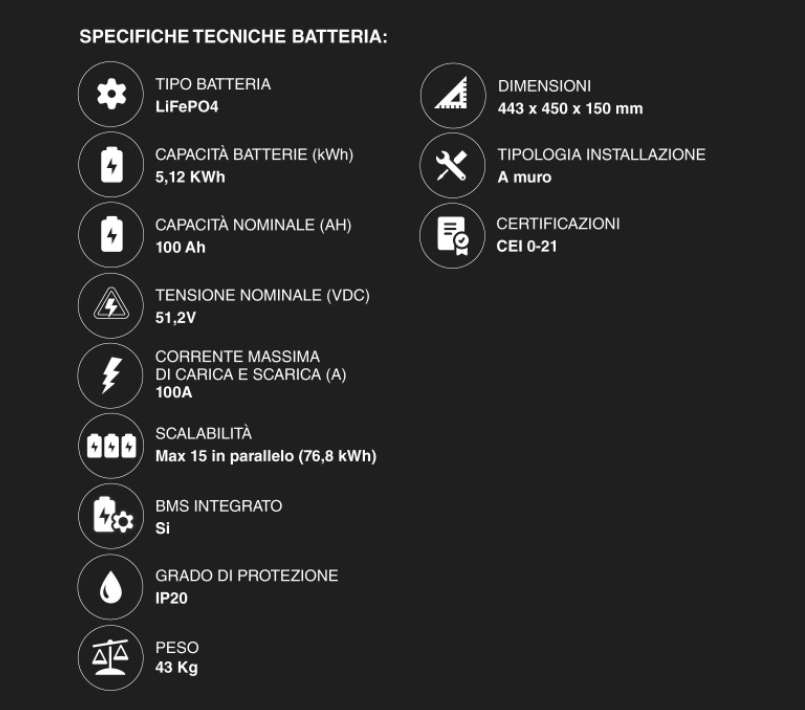 Modularità: Il sistema è predisposto per aggiungere altre batterie in parallelo (fino a 16 unità).