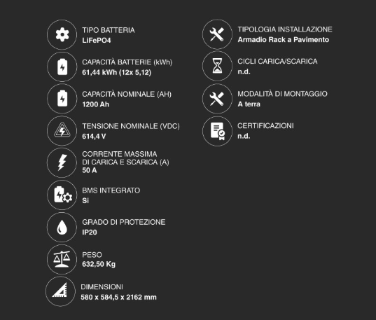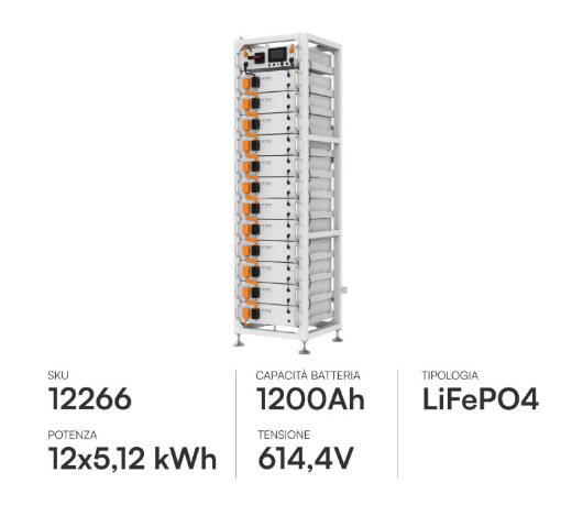 Configurazione: Tipicamente composta da moduli ad alta tensione (es. 12 moduli da 5,12 kWh in serie).