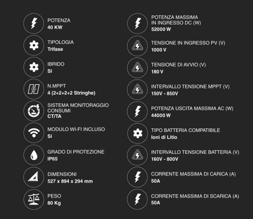Gestione Multi-Stringa: Un inverter di questa taglia supporta solitamente un campo fotovoltaico sovradimensionato (fino a 55- 60 kW/h), permettendo di saturare l'autoconsumo anche in condizioni di scarsa luminosità.