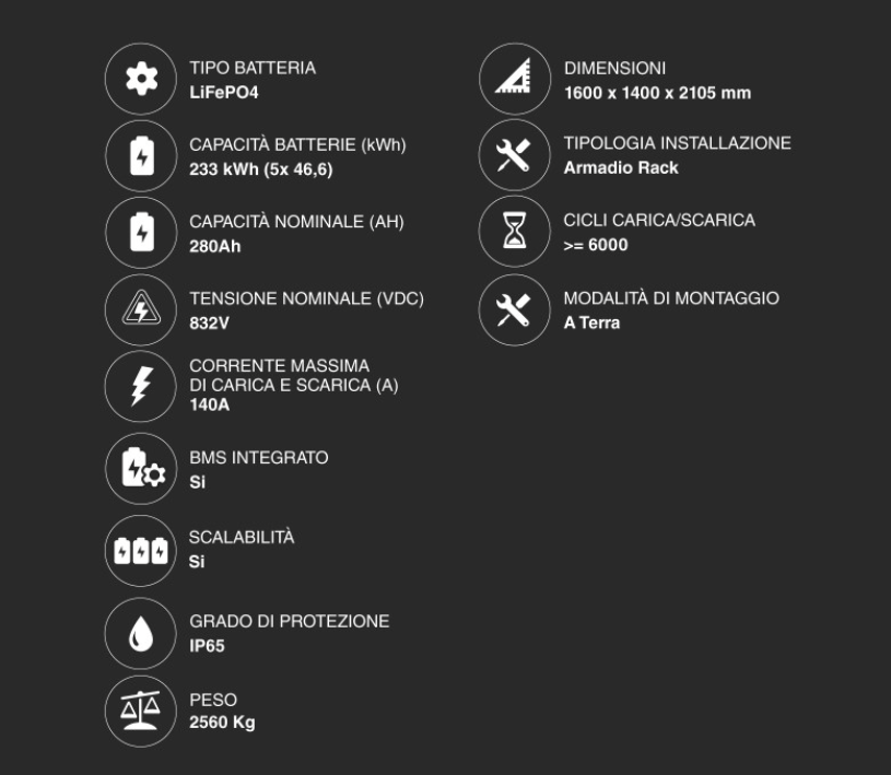 Peso Complessivo: Il sistema completo (inverter + cabinet batterie) pesa circa 2.400 - 2.700 kg.