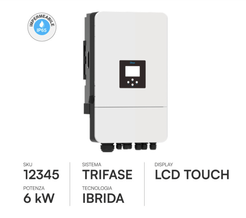 L'articolo ERC12345 (SKU V-Tac 12345) identifica l'Inverter Ibrido Trifase da 6kW, una delle soluzioni più equilibrate per il mercato residenziale italiano di fascia alta.