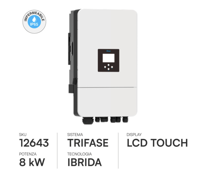 L'articolo ERC12643 (SKU V-Tac 12643) identifica l'Inverter Ibrido Trifase da 8kW, una soluzione di fascia alta progettata per gestire impianti fotovoltaici residenziali e commerciali di dimensioni generose.