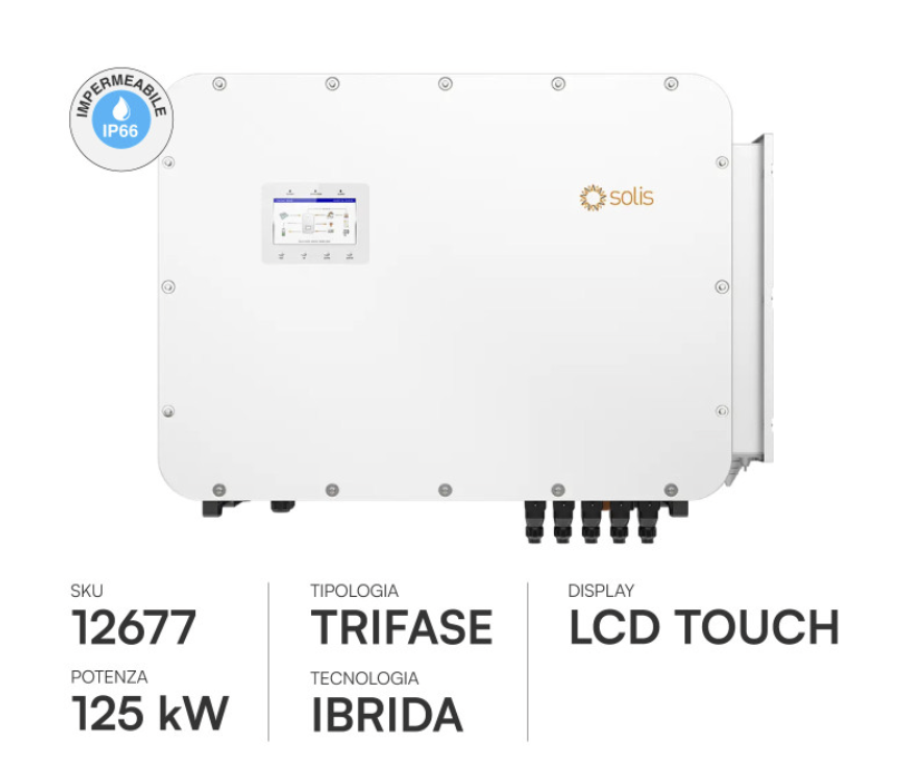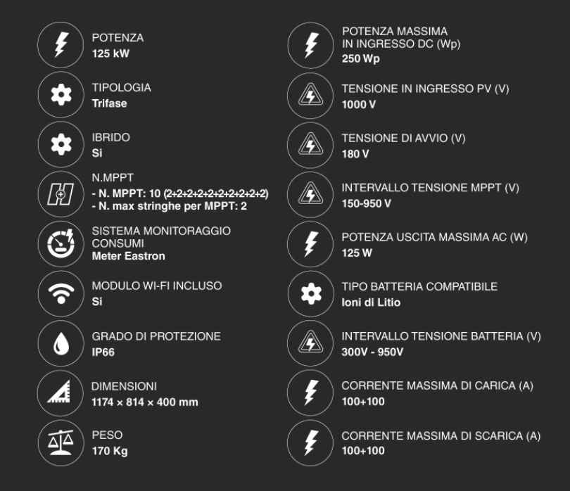 125.000W di Potenza AC: Una capacità di erogazione imponente, in grado di alimentare contemporaneamente macchinari industriali pesanti, sistemi di condizionamento centralizzati di grandi dimensioni e intere infrastrutture di ricarica per mezzi elettrici pesanti (camion o flotte aziendali).