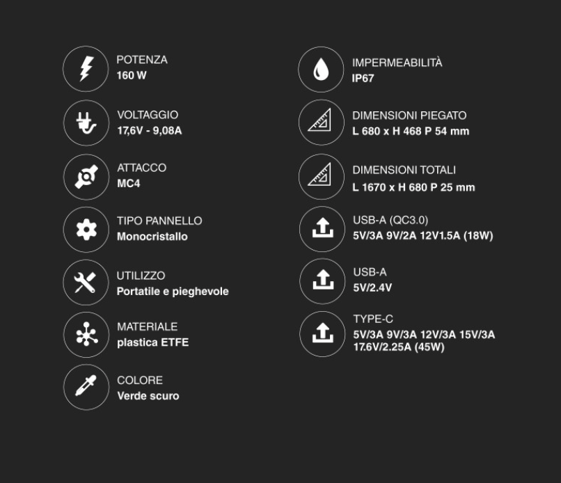 - Meccanica a Fisarmonica: Le 4 sezioni ripiegabili permettono un orientamento millimetrico verso il sole e una chiusura a valigetta salva-spazio per il trasporto.