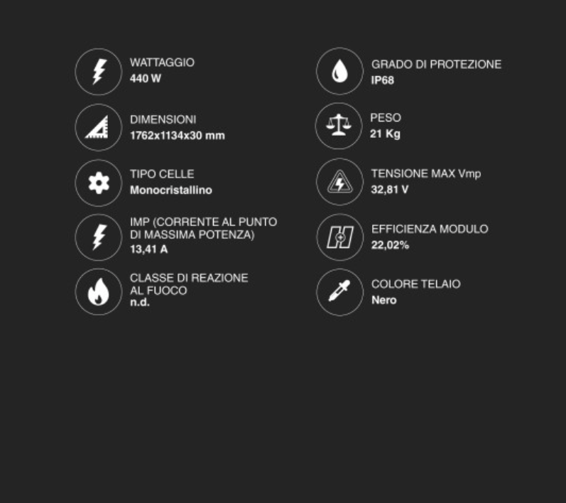 | Tipo di Celle | Monocristallino (108 unità) |