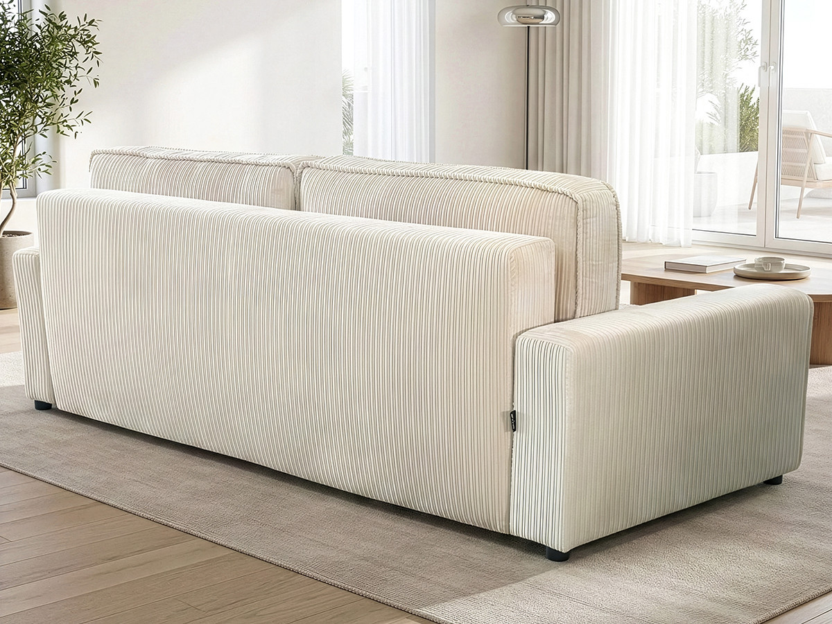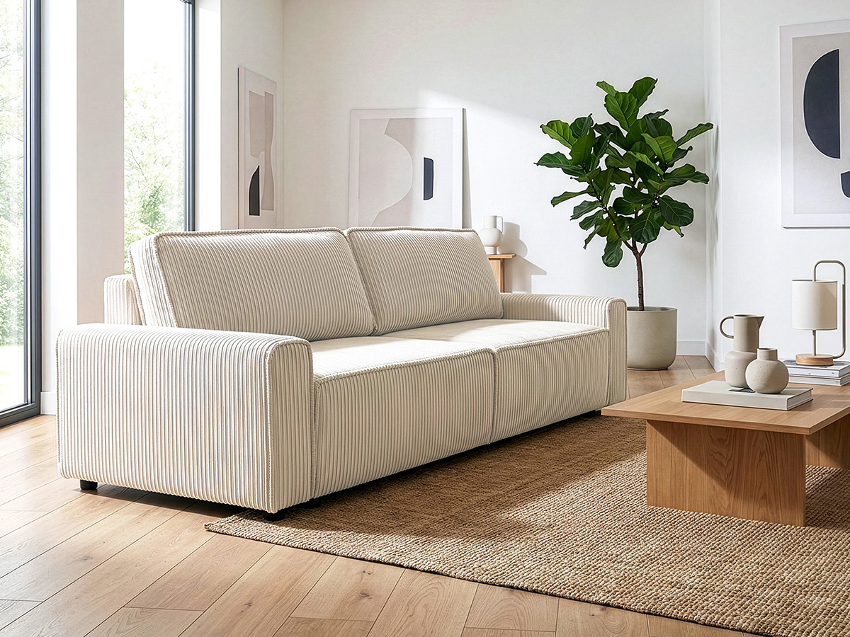 Il velluto a coste beige aggiunge un tocco di raffinatezza a qualsiasi salotto e il suo colore neutro si adatta a qualsiasi arredamento. La consistenza morbida e l'imbottitura soffice di questo divano vi offriranno un comfort ottimale per rilassarvi dopo una lunga giornata.