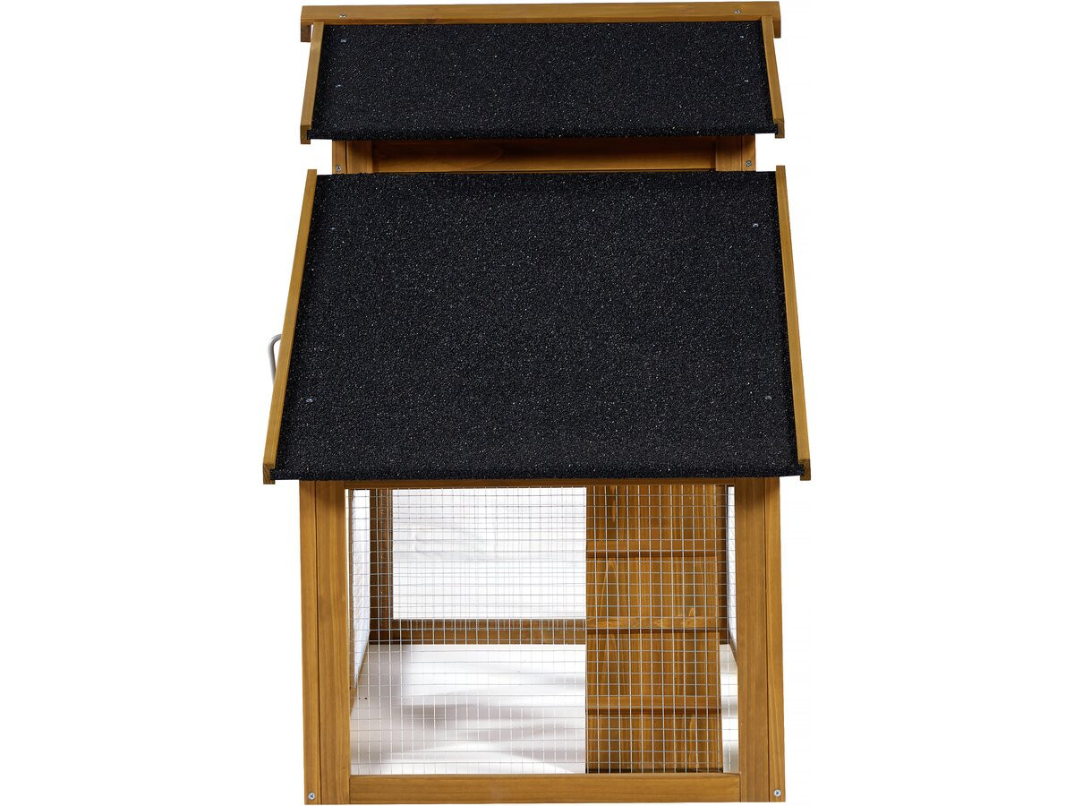 Il dormitorio incorporato comprende un posatoio e una cassetta per il nido. Il tetto in legno protegge l'intero pollaio dalla pioggia. È inoltre antiruggine e resistente ai raggi UV.