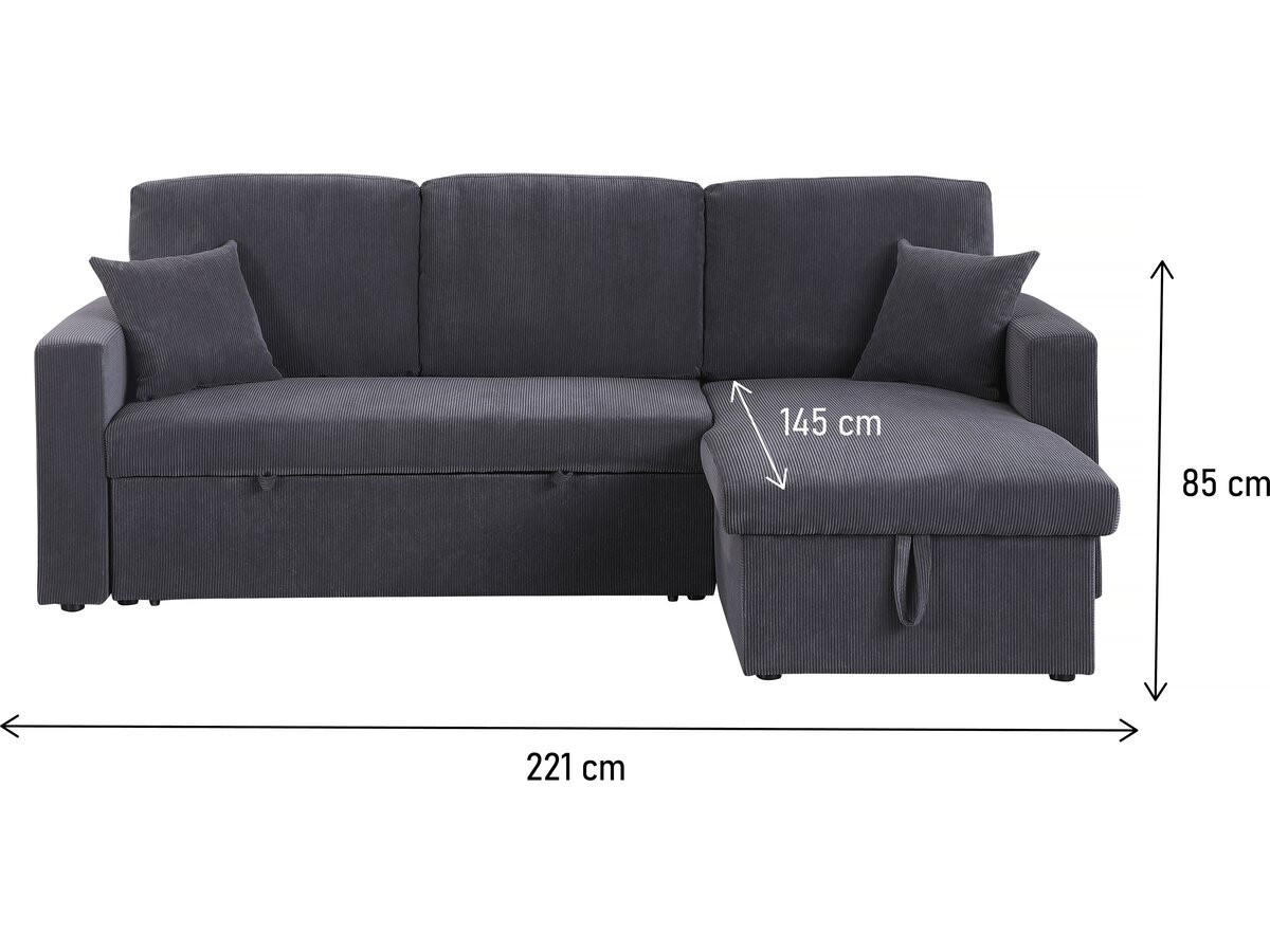 Divano letto angolare reversibile con contenitore "Alain" - Velluto a coste - Divano: 221 x 145 x 85 cm - Letto: 192 x 137 x 43,5 cm - Capienza (penisola)Scopri questo articolo che diventerà un must per il tuo soggiorno! Scegliendo questo modello, otterrai un articolo efficiente dal design accessibile. Le notevoli proporzioni, che offrono tre ampie sedute, e il design senza tempo, rendono questo divano il modello perfetto per te e la tua famiglia. Questo divano angolare, che unisce sobrietà e comodità, non ti deluderà. Concediti un momento di relax con familiari o amici scegliendo questo modello che ti conquisterà sotto ogni aspetto!