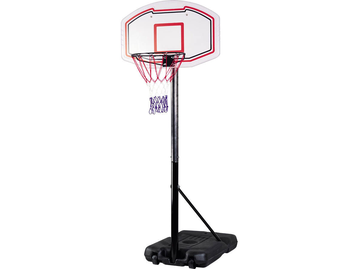 Canestro basket MICHAEL - Tabellone in polipropilene ad alta resistenza, 90 x 60 cm con cerchio in metallo ? 46 cm, rete tricolore in nylon e fit di fissaggio incluso, bianco e rosso - Canestro in metallo, con sistema telescopico regolabile, altezza 192 - 260 cm, diametro 76 mm, spessore 0.2 mm - Base in vinile riempibile con sabbia (23 kg) o acqua (15 kg) e equipaggiato di 2 ruote integrate.