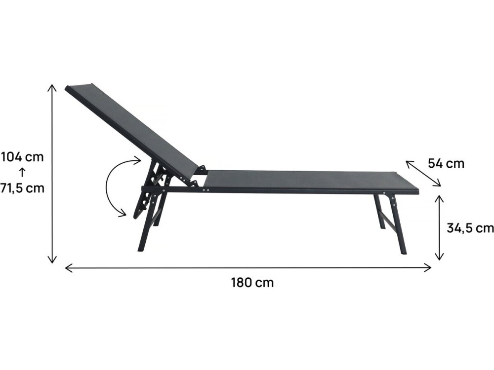 Dimensioni: 180 x 54 x 104 cm. Altezza regolabile: 71,5/104 cm - Altezza seduta: 34,5 cm - 4 inclinazioni. Una lunghezza generosa che permette di stendersi completamente senza che i piedi restino "appesi".