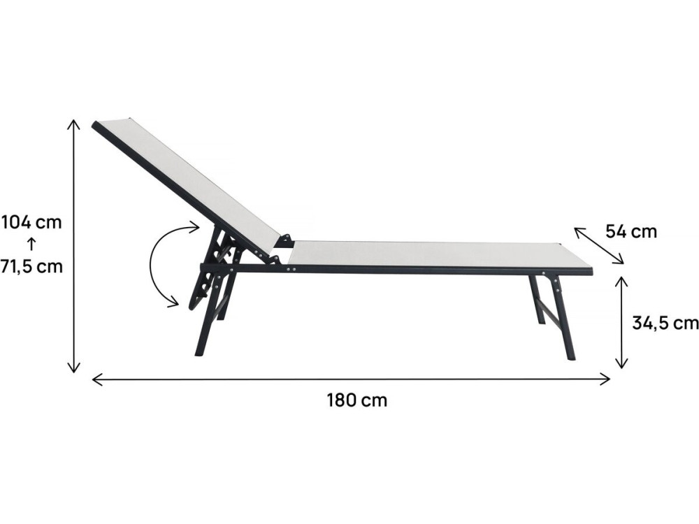 Dimensioni Generose: 180 x 54 x 104 cm. Altezza regolabile: 71,5/104 cm - Altezza seduta: 34,5 cm - 4 inclinazioni. Con una lunghezza di 1,80 metri, permette di distendere completamente le gambe, offrendo un comfort simile ai lettini professionali da spiaggia.