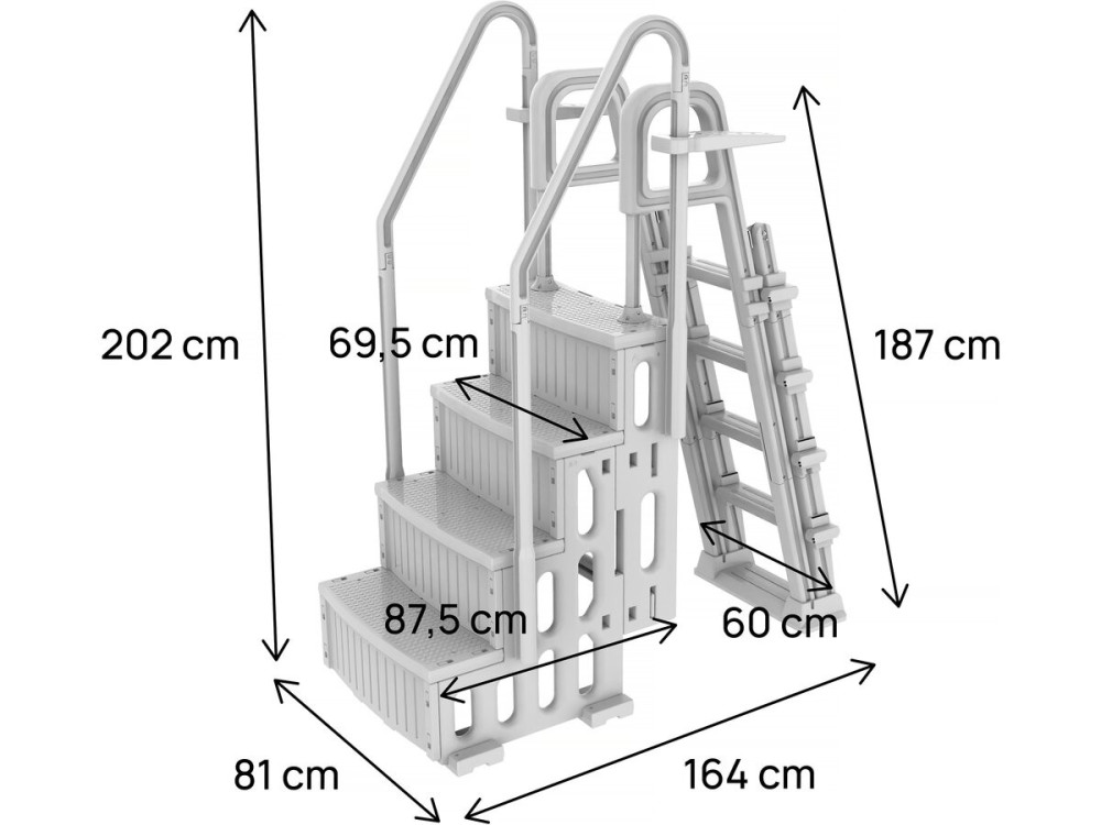 Sistema di Sicurezza "Flip-up": La rampa di gradini esterna è incernierata. Può essere sollevata verso l'alto e fissata con un sistema di sicurezza a scatto. Una volta alzata, l'accesso alla piscina è fisicamente impossibile per un bambino.